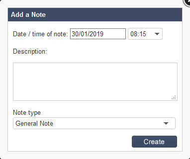 A pop-up window will appear. Just add the details of the note into the box under “Description” and set what type of note this is (“general note” or “email sent”), set a date and time for the note, and then click the “Create” button to save the note.