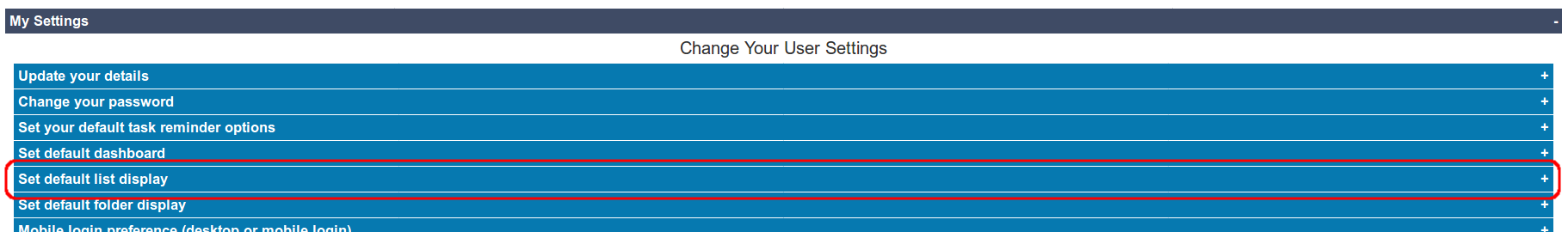 Click on the row labelled “Set default list display“.