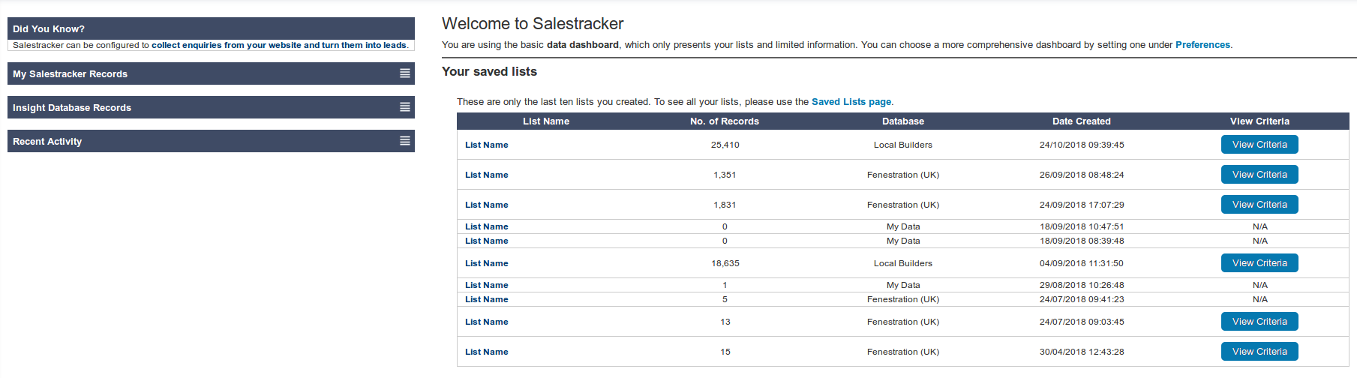 The Data dashboard shows the last ten lists you have built. This is the default view for users subscribed to the data-only version of Salestracker.