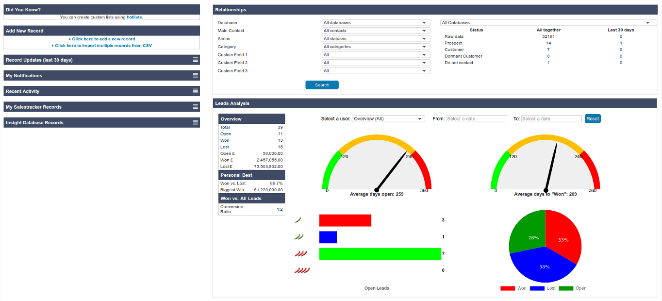 The dashboard is the view you are first presented with when logging into Salestracker (the default “home” screen). Salestracker comes with several different dashboards built-in, and you can select which dashboard view you would like to show by default.