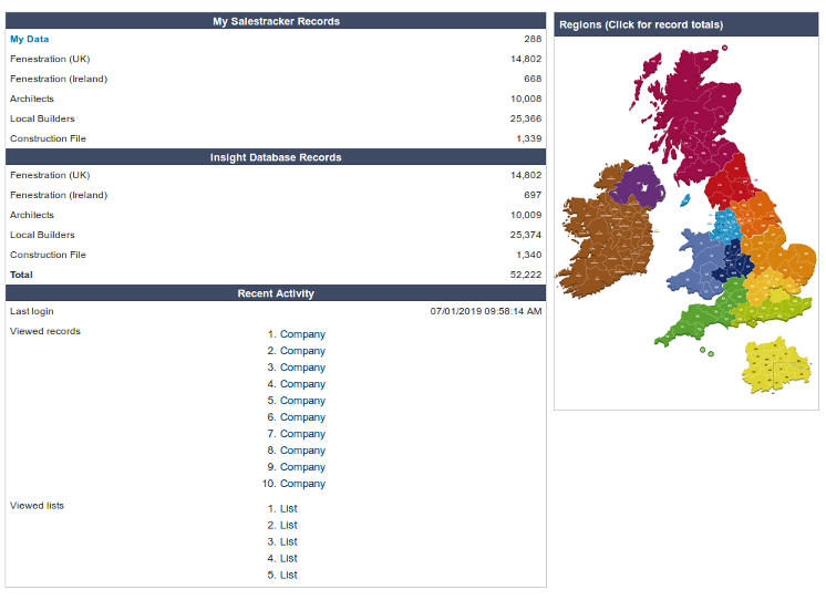 The Simple dashboard only provides subscription figures based on what databases you are subscribed to. It features an interactive clickable map of the UK with subscription counts for each region.