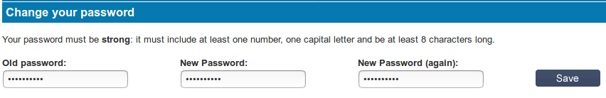 This will reveal three boxes – fill in your old password and your new password twice, and then click on “Save” to update your password. Please note we ask you to enter your new password twice to ensure you have typed it correctly!