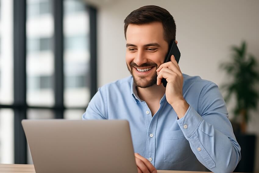 A happy B2B customer uses both phone and laptop to contact Insight Data. This supports the article’s focus on customer insight and shows how easy it is to access Insight’s support and services.