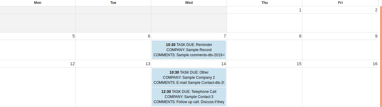 The calendar will show any tasks that have been shown on the Tasks Overview page, and will update to reflect the changes made to the filters above.