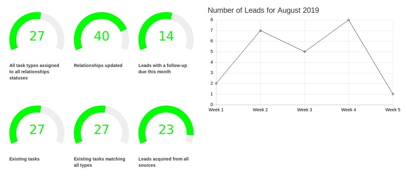 The doughnut charts will reflect different KPIs and the line chart displays how many leads were added to the system during each week of the month.