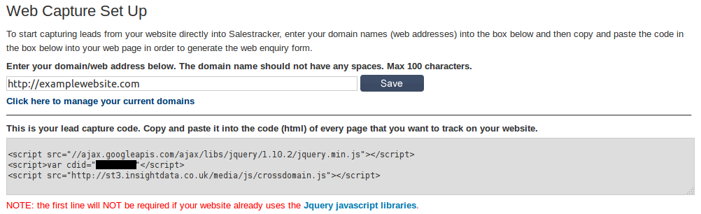 Clicking on “Web Capture Set Up” will enable you to get your website to communicate with Salestracker. Within the section ‘Enter your domain/web address below’ enter the address of your company website (e.g. “mydoors.co.uk”) and click “Save“. This will inform Salestracker to accept enquiries from your website – without following this step Salestracker will not accept enquiries from your domain!