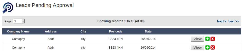 Clicking on “Pending Web Capture Leads” will take you to the Leads Pending Approval page. This is displayed as a table showing the general enquiry (lead) information with the option to show more specific information by clicking on the “View” button.