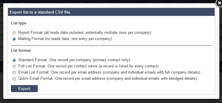 - Report format – exports all the leads according to what you’ve filtered. Exports the leads data specifically.