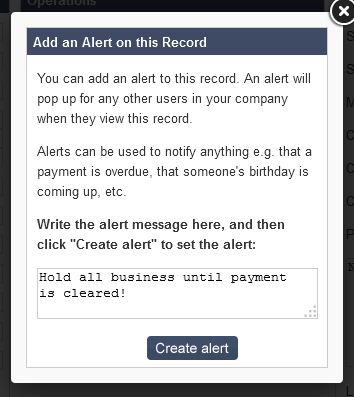 If there is a pertinent bit of important information you need to convey to other users on your subscription about this company (e.g. defaulting on payments), you can set an “alert” on the record. Start by clicking on the “Create an alert” button. A pop-up box will appear:
